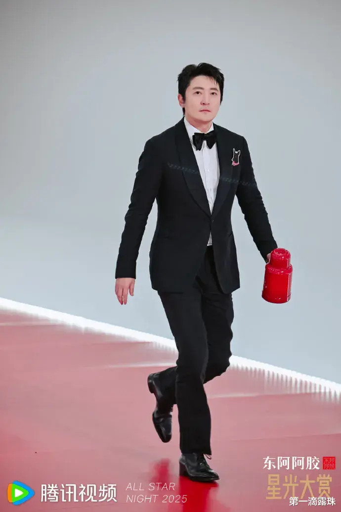 2025星光大赏的红毯,本以为是新生代流量的主场,没想到被郭京飞用两个“硬核道具”抢了风头。一身板正黑西装的他,左手拎着《老舅》里的红色水壶,胸前贴着《驻站》的警犬玩偶“依卡”,这波跨剧联动直接冲上热搜,网友笑称“正经西装里藏着喜剧魂,这才是红毯界的清流”。