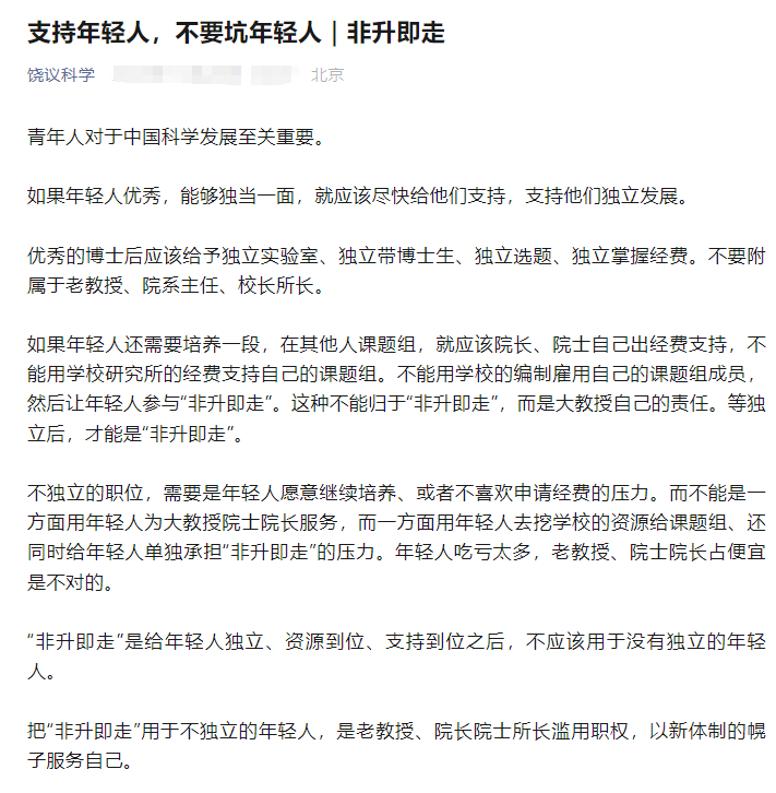 但是随着这么多年的实施,其实里面很多的问题也凸显了。知名学者饶毅就发文直指老教授、院系主任、校长所长,认为他们滥用职权,他说:如果年轻人优秀,能够独当一面,就应该尽快给他们支持,支持他们独立发展。不要附属于老教授、院系主任、校长所长。